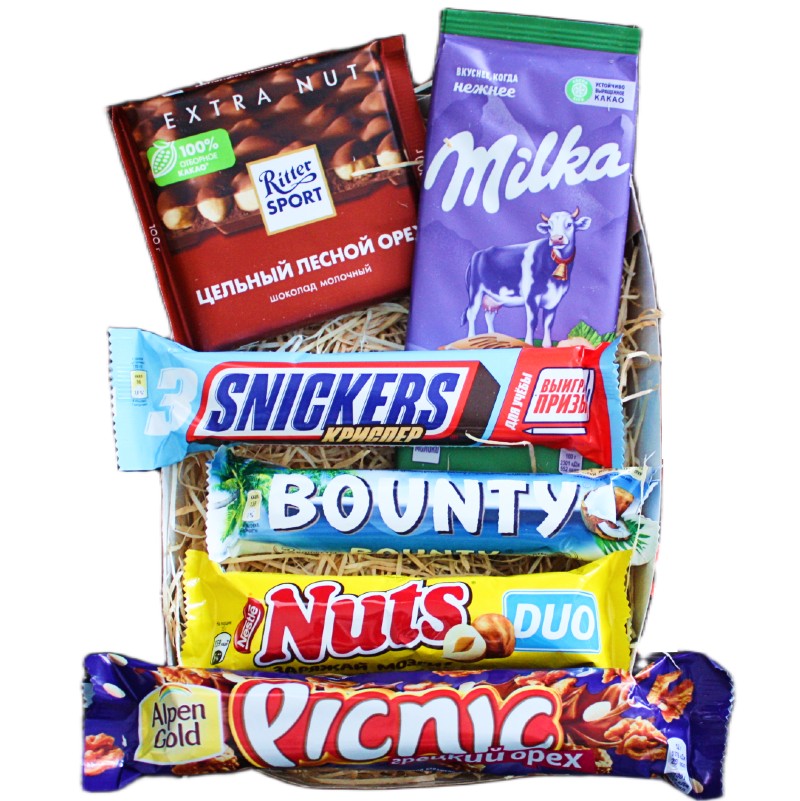 В подарочной коробке 100 граммовый немецкий шоколад Риттер Спорт с цельным лесным орехом, большая плитка молочного шоколада Милка с цельным фундуком, батончик Пикник, шоколад Сникерс Криспер, батончик Натс Дуо и кокосовый батончик Баунти. Часть шоколадок состоит из двух частей, напоминающих мини конфеты (Bounty Minis и Nuts Minis) Упаковка подарочного набора представляет собой картонную крафт-коробку, перевязанную красной лентой. Сладкий подарок идеально подойдет любимой женщине, девушке, маме. Такой набор сладостей иногда выбирают для презента в школу для учителя, преподавателя или классного руководителя, а также в детский сад для воспитателя. В наборе сладости от Alpen Gold, Марс, Нестле и Mondelez. Для второй половины вкусный подарок подходит на годовщину, 14 февраля или День любви, семьи и верности. Если подумать о На работе можно подарить начальнику, коллеге, руководителю или директору. Идеально подойдет как к чаю, так и кофе. Шоколадные конфеты обрадуют Ваших любимых бабушек и дедушек. И без того низкая цена не позволяет нам принимать участие в распродажах, но прикол подарка нашей сборки в том, что купив по-отдельности все компоненты, крафт коробку, наполнитель, в сумме выйдет значительно дороже, при этом нужно не забыть проверить везде даты производства и сроки годности. Сладкий бокс выбирают в качестве оригинального подарка сестре или брату, дяде или племяннику. Подарок мальчику на 10 лет или девочке на 8 лет - осталось только выбрать, кому подарить орехи в шоколаде. Продукты питания требуют особого внимания, но мы работаем напрямую с производителем, поэтому гарантируем свежесть и высокое качество кондитерских изделий. Мы продаем наборы шоколадок последние 5-7 лет, за это время научились бережно упаковывать свит боксы, чтобы они приехали к Вашему другу или подруге на др без повреждений. Сладости для детей не очень полезны, но незаменимы в качестве десерта. Подарки на Новый Год в виде шоколадных батончиков в коробке - креативный выбор как для взрослого, так и для ребенка от 3-4 лет. Это один из немногих вариантов, который хорошо подойдет на любой гендерный праздник, как отцу к 23 февраля, так и матери на Международный женский день. Среди вариантов боксов на распродаже для подростков рекомендуем также посмотреть на товары, которые в ней не участвуют. Мужские подарки на День пограничника, день ВДВ, день ВМФ, день ВКС и ВВС в виде шоколадного набора обрадуют Ваших отцов, парней, любимых супругов. Sweet box выбирают на выписку из роддома, на новоселье.