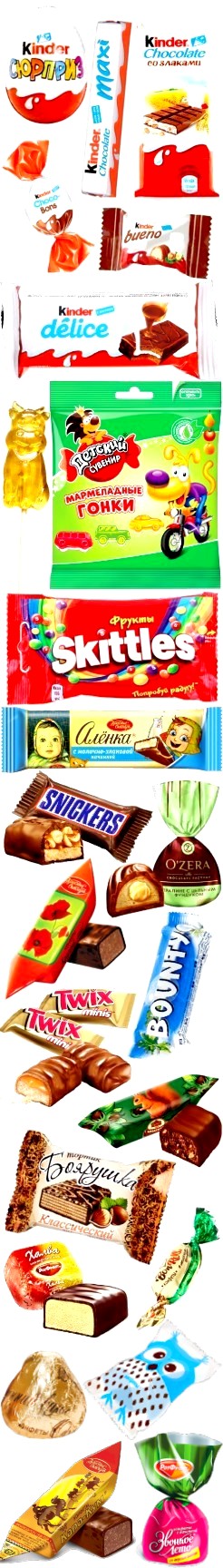 Киндер Сюрприз (1 шт), Киндер Макси (1 шт), Киндер Кантри (со злаками) (1 шт), Киндер Делиз (1 шт), Киндер Бонс мини (1 шт), Киндер Буено мини (1 шт)