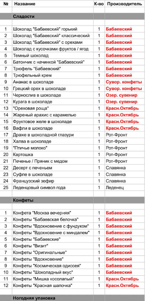 Шоколад "Бабаевский" горький (1 шт), Шоколад "Бабаевский" классический (1 шт), Шоколад "Бабаевский" с орехами (1 шт), Шоколад с кусочками фруктов / ягод (1 шт), Темный шоколад (1 шт), Батончик с начинкой "Бабаевский" (1 шт), Трюфель "Бабаевский" (1 шт), Трюфельный крем (1 шт), Конфета "Москва вечерняя" (1 шт), Конфеты "Бабаевская белочка" (1 шт), Конфеты "Вдохновение с фундуком" (1 шт), Конфеты "Вдохновение с миндалем" (1 шт), Конфеты "Бабаевские" (1 шт), Конфеты "Визит" (1 шт), Конфеты "Оригинальные" (1 шт), Конфеты "Вдохновение" (1 шт), Конфеты "Космическая одиссея" (1 шт), Конфеты "Шоколадный вкус" (1 шт)